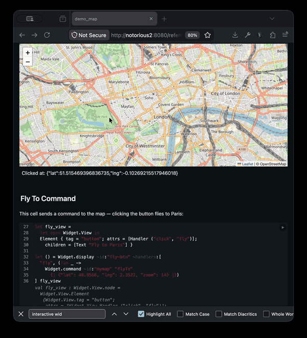 Each widget either has direct DOM callbacks, or injects some javascript glue code into the frontend, which then communicates between back and frontend using JSON. This layer is mostly "stringly typed" using the widget library. On top of that you can then build more strongly typed libraries like the Leaflet library that give a more pleasant interface. Communications happen in both directions, so code can cause widgets to change, and interaction with the widgets can cause code to execute.