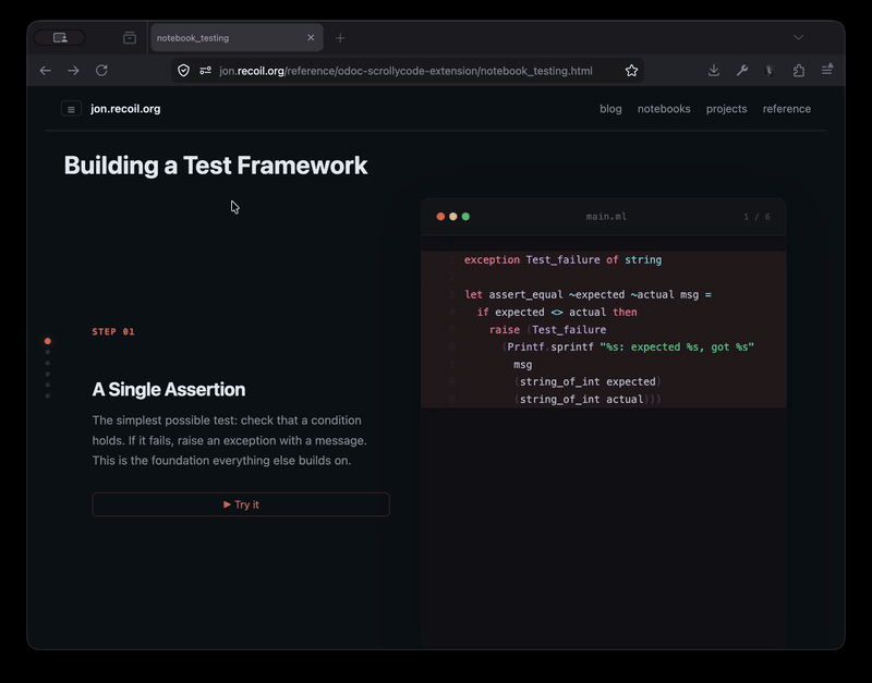 The odoc-scrollycode-extension is based on Rodrigo Pombo's work and similar scroll-linked tutorial sites like MLU's decision trees page. I initially had Claude come up with a sketch to show it working, complete with Merlin integration so that types-on-hover work: