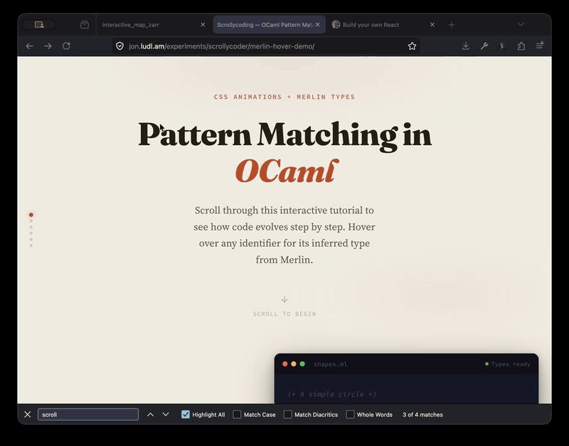 The odoc-scrollycode-extension is based on Rodrigo Pombo's work and similar scroll-linked tutorial sites like MLU's decision trees page. I initially had Claude come up with a sketch to show it working, complete with Merlin integration so that types-on-hover work: