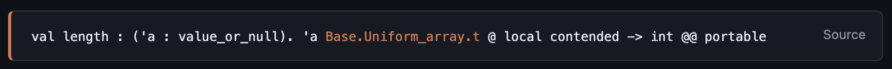 OxCaml support for odoc was contributed by Luke Maurer early on after OxCaml was released. However, this only fixed the build of odoc, it didn't give it any mode or layouts, nor any of the other new features of OxCaml. I asked Claude to look through the way the toplevel prints these annotations and port them to odoc, and that's been implemented on this site. For example, see Base.Uniform_array.length - you can see there the portable, local and contended annotations on the type. If you click on the source link, you'll see I also added some improvements to the source rendering - there are many more links now and we've got the ability to link to source from doc comments and mlds.